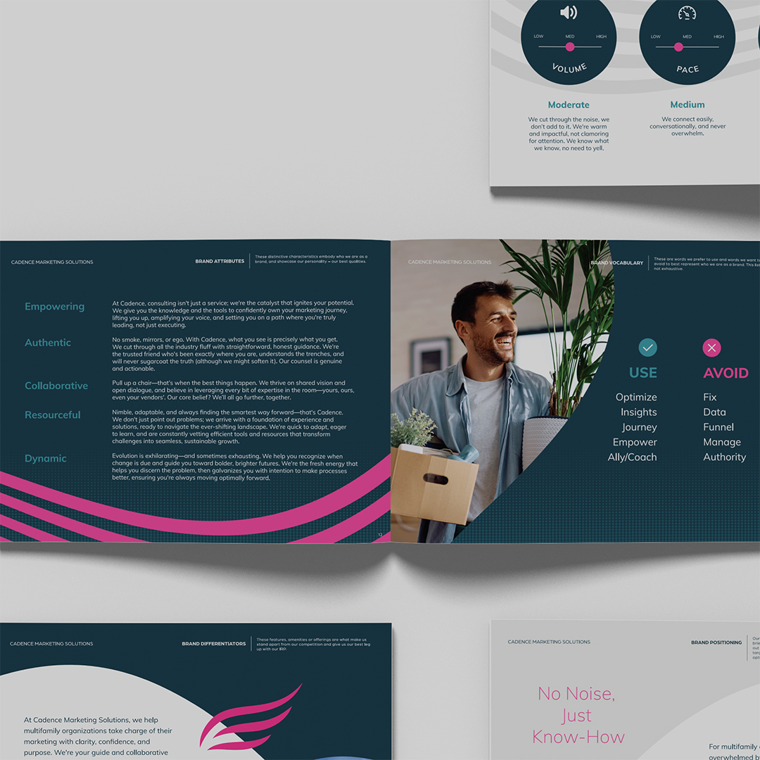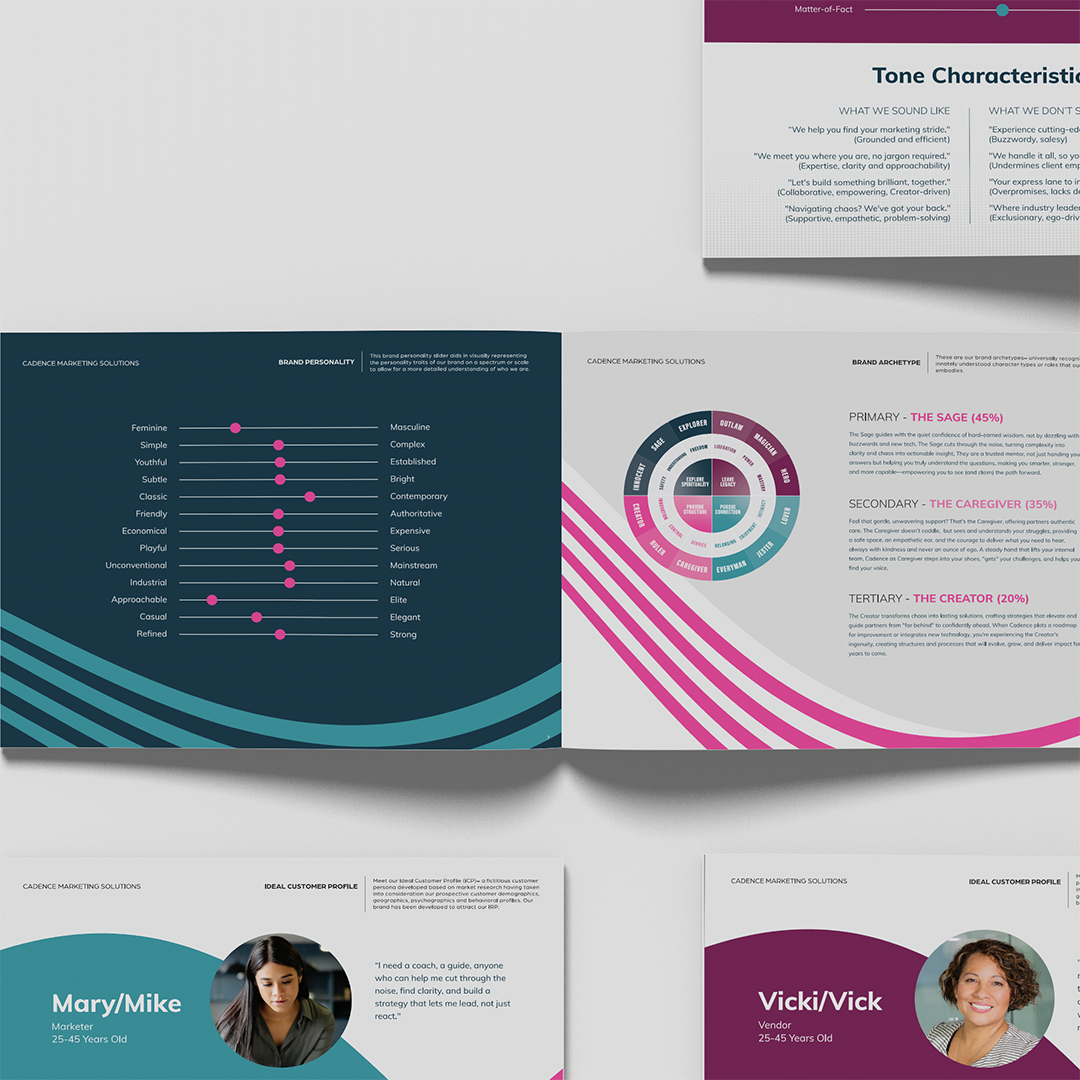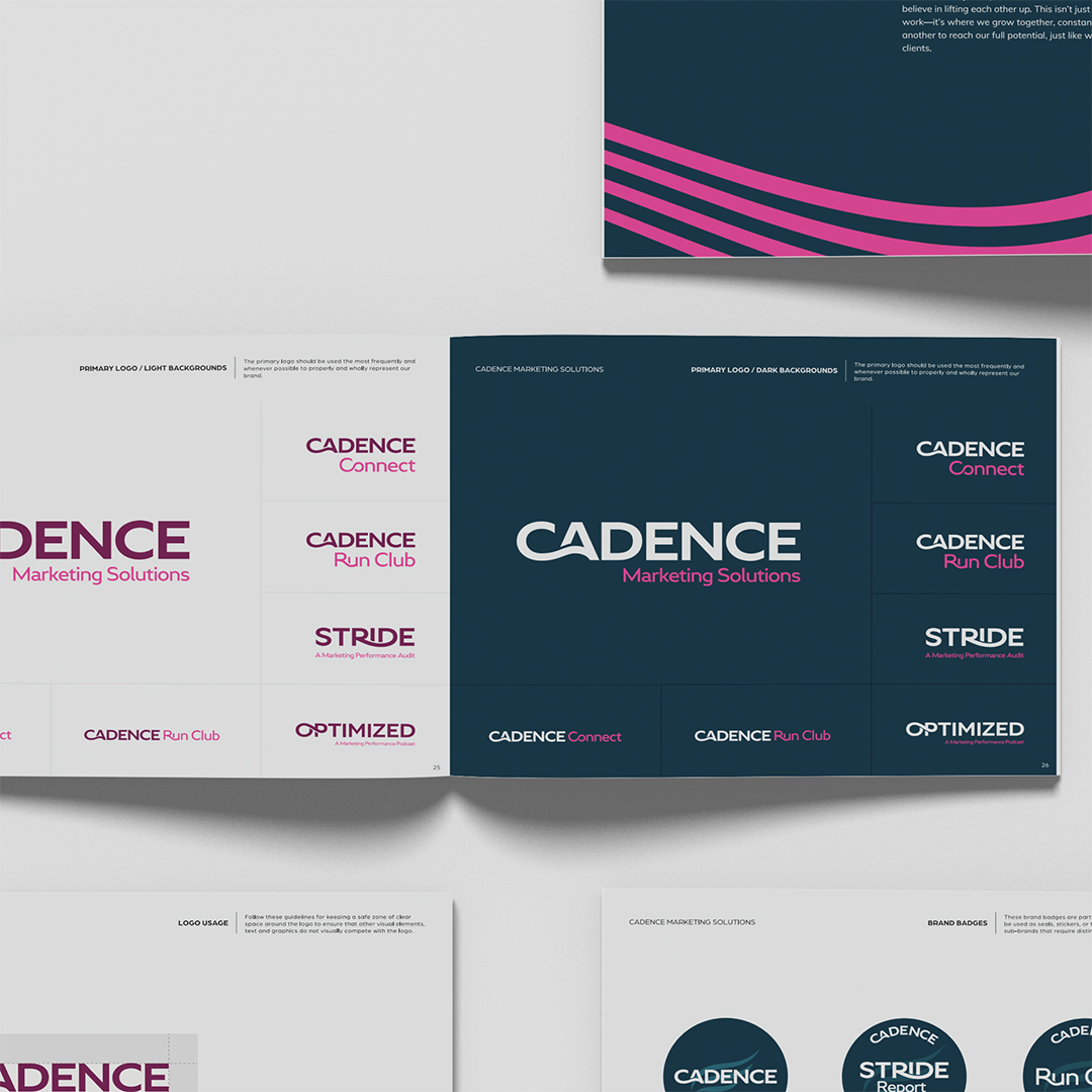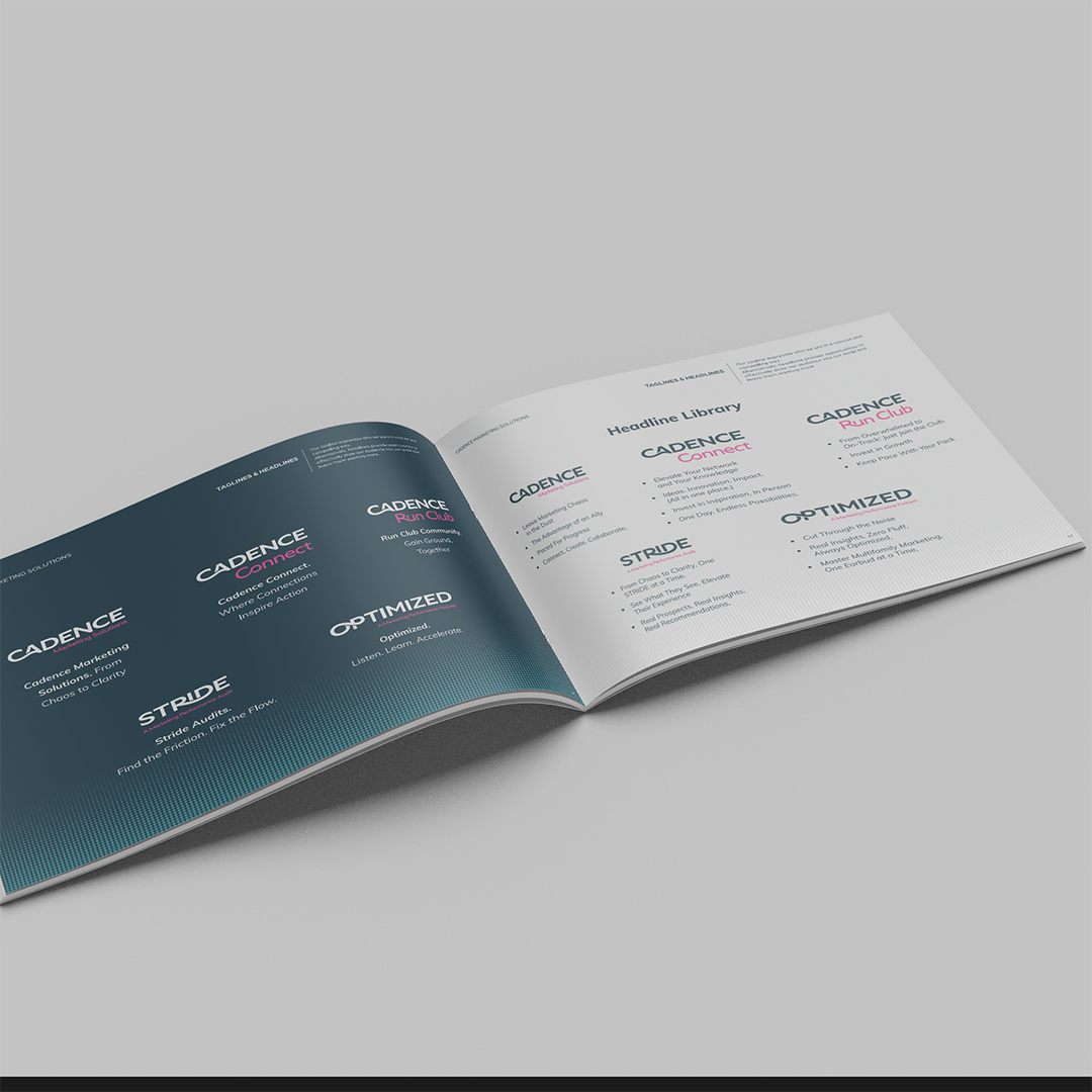 After eight years of growth, Cadence Marketing Solutions had developed a strong consultancy and four distinct sub-brands — but without a unified visual and verbal system to tie them together, the parent brand was getting diluted. We built a comprehensive brand identity system that brought the full Cadence ecosystem into alignment, giving their team a cohesive look, a shared language, and the tools to show up consistently across every sub-brand and touchpoint.