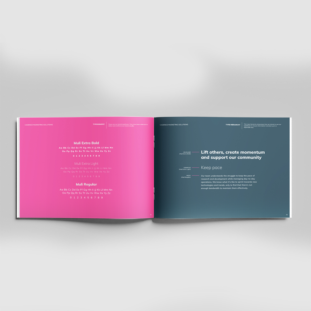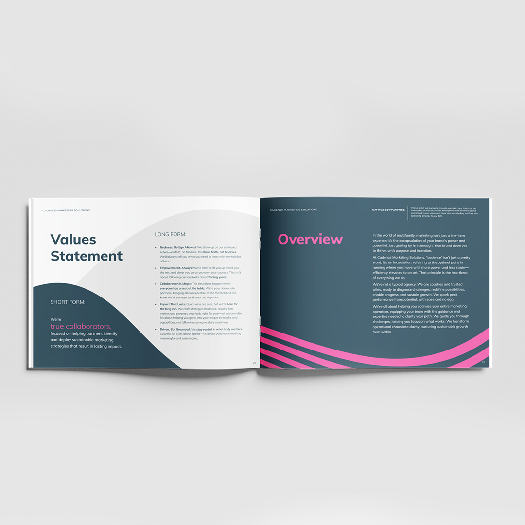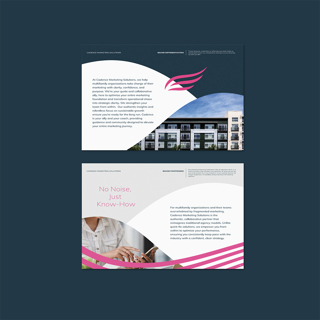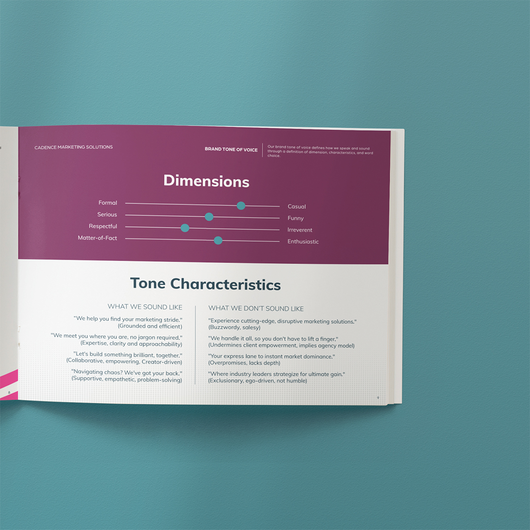 After eight years of growth, Cadence Marketing Solutions had developed a strong consultancy and four distinct sub-brands — but without a unified visual and verbal system to tie them together, the parent brand was getting diluted. We built a comprehensive brand identity system that brought the full Cadence ecosystem into alignment, giving their team a cohesive look, a shared language, and the tools to show up consistently across every sub-brand and touchpoint.